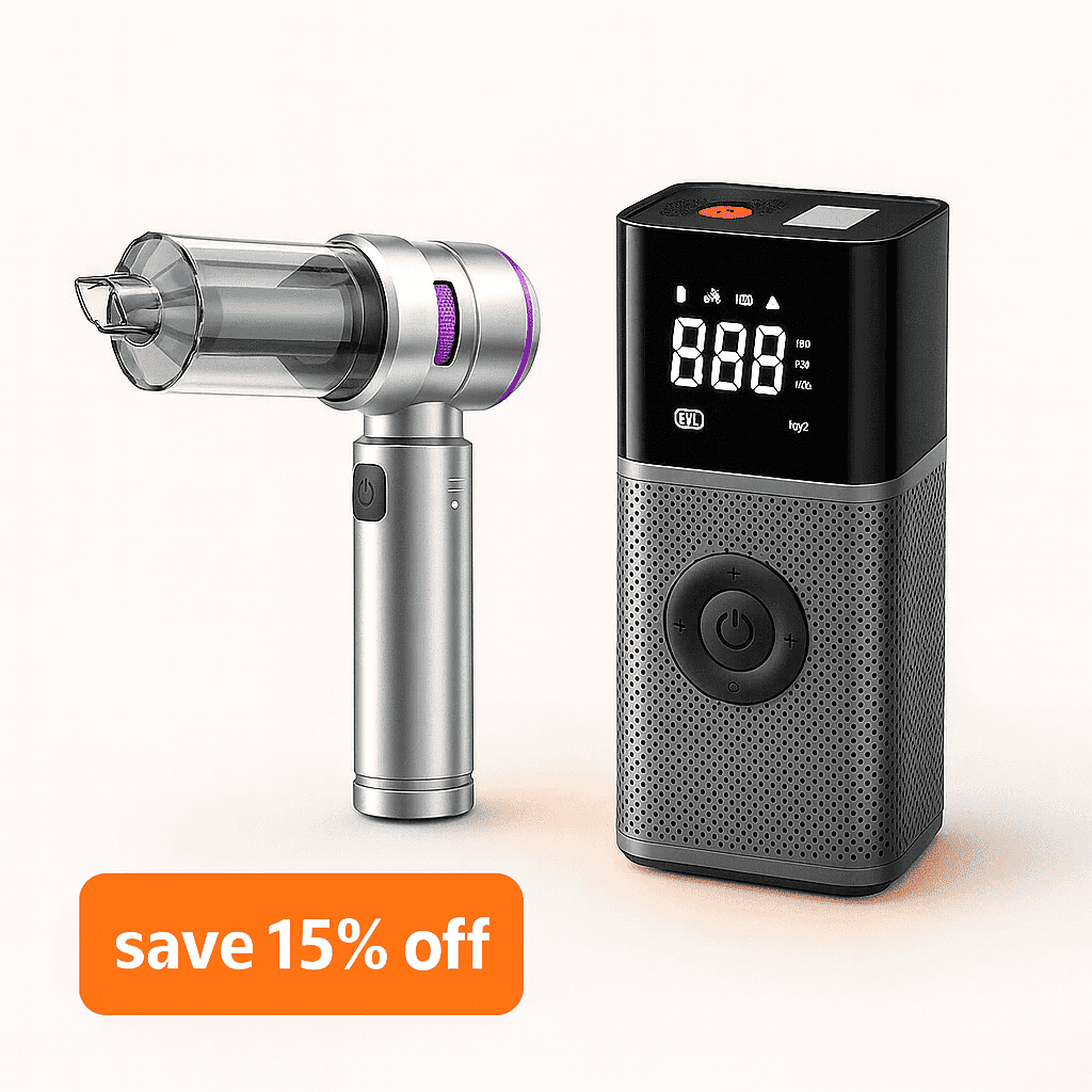 This bundle includes 1 Smart Tire Inflator + 1 TurboClean Pro Cordless Vacuum — smarter car care, save 15% today.