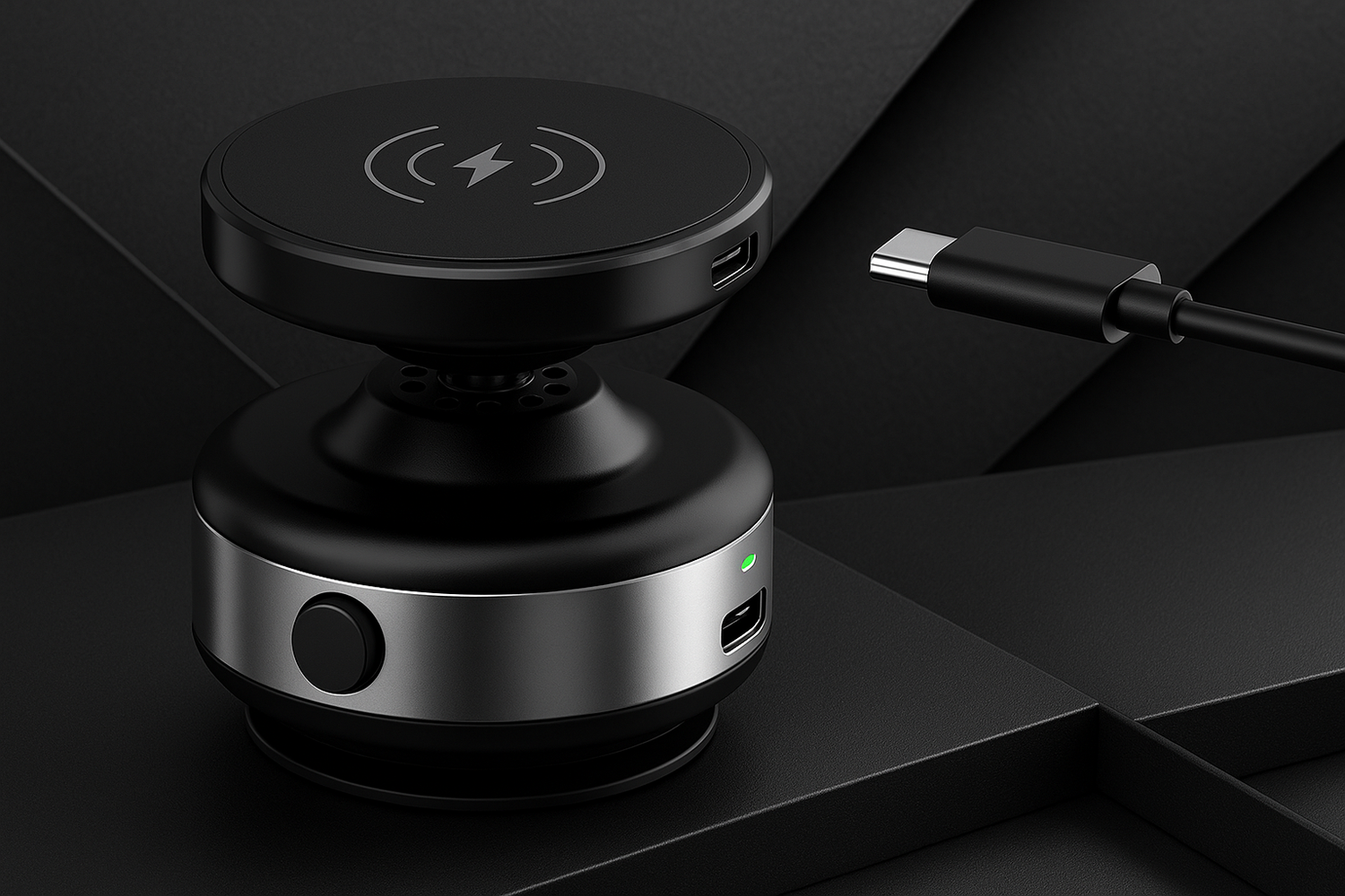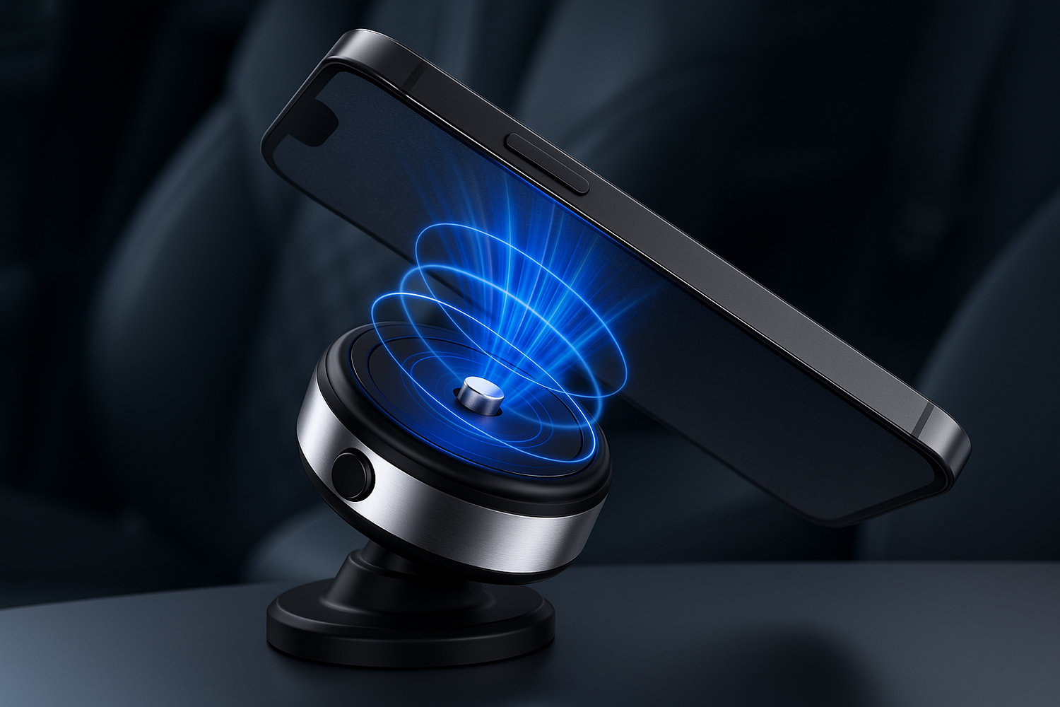 The mount combines electric vacuum suction + N52 magnets, holding up to 5 kg. It stays rock-solid on smooth surfaces, even on bumpy roads