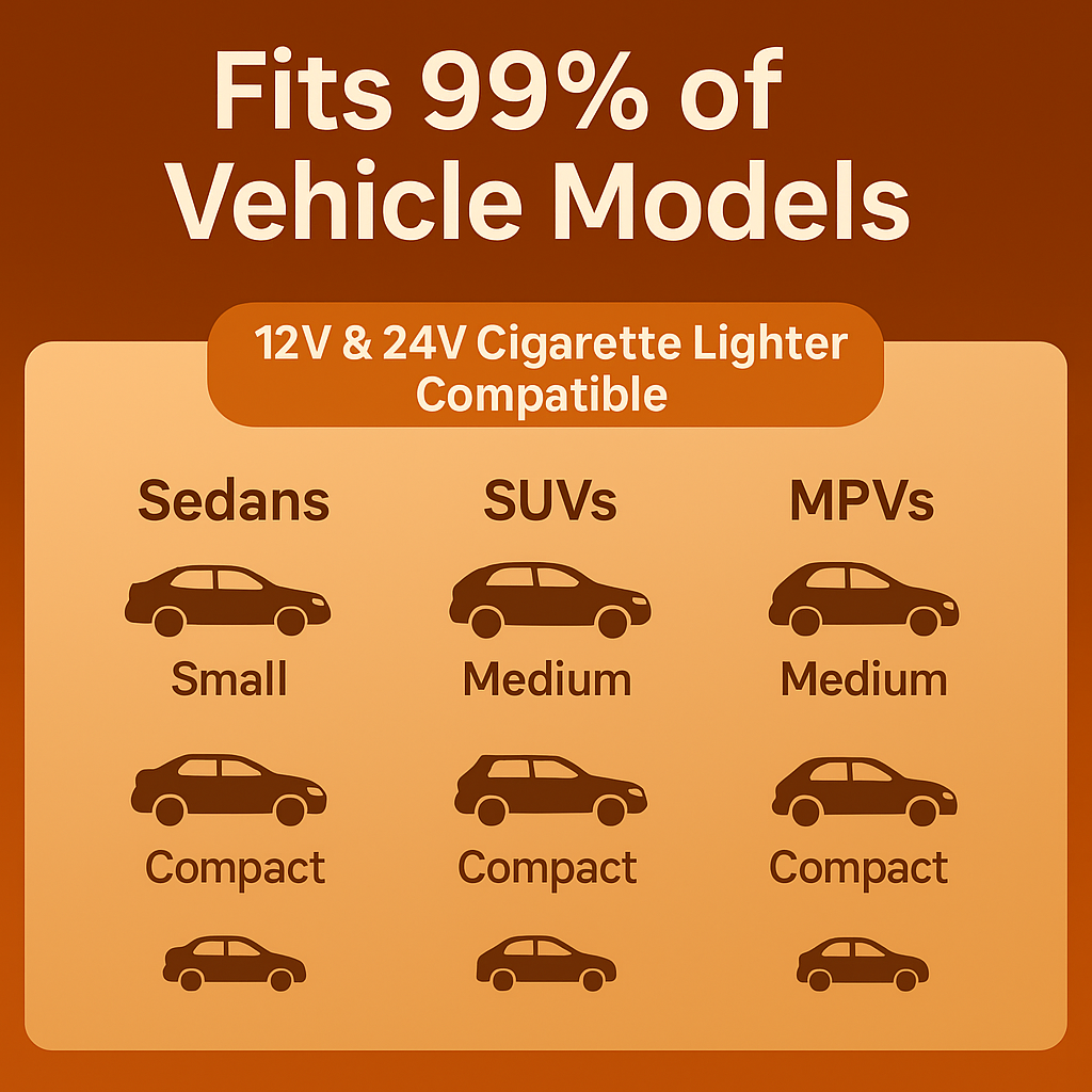 🚗 Works with 12V (cars/SUVs) and 24V (trucks/buses). Just plug it into the cigarette lighter socket.