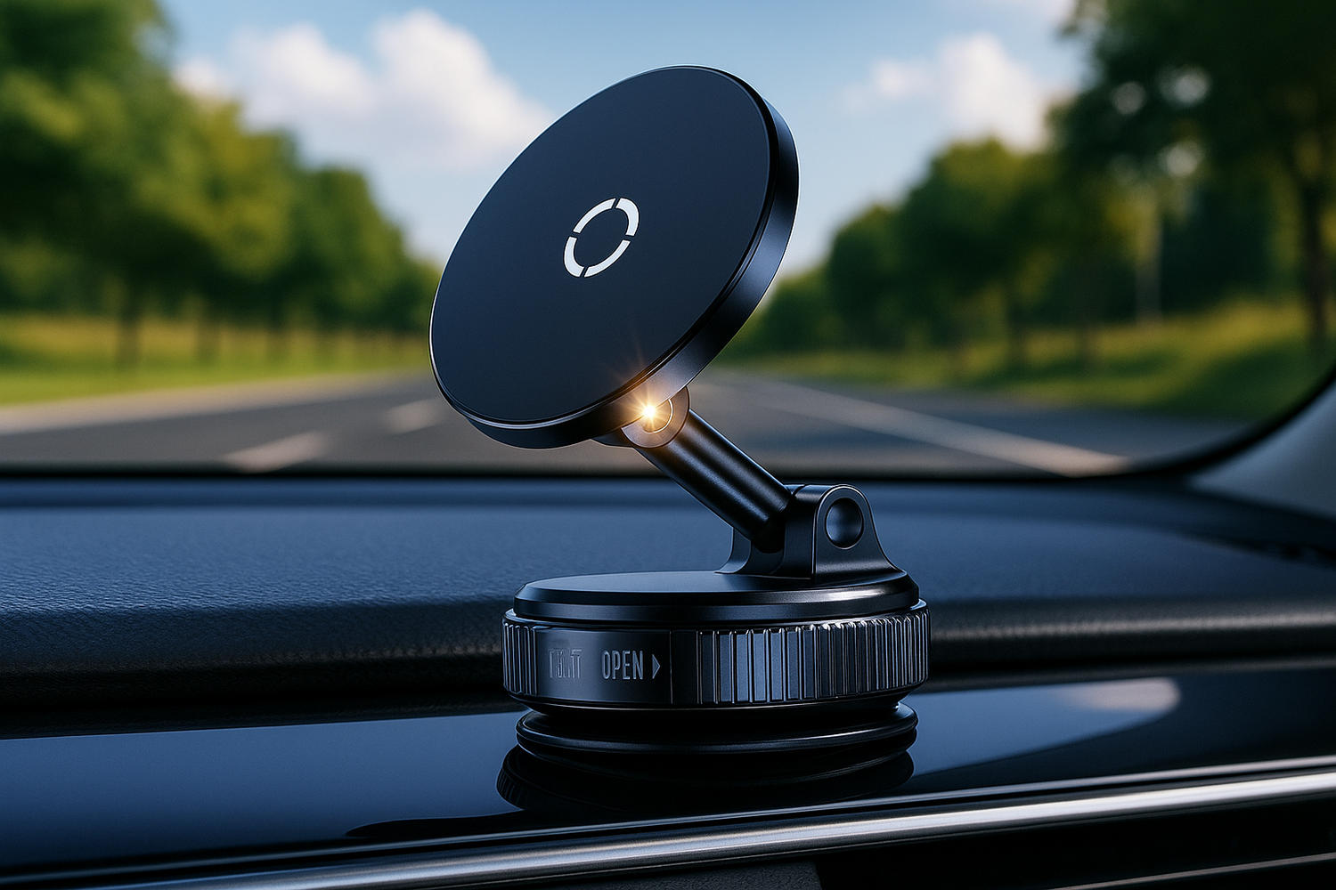 The vacuum cup with nano-gel grips dashboards or windshields securely and releases cleanly with no residue. Stays put in heat, cold, and vibration.